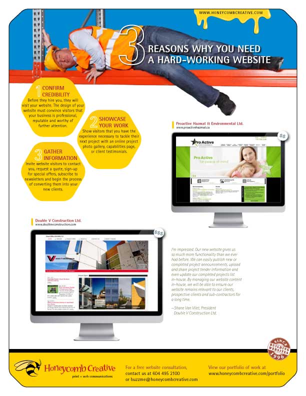 Hard-working construction industry websites is the latest direct mail promo from Honeycomb Creative. We’re proud of the work that we do for clients, and we like to show it off – download the PDF
