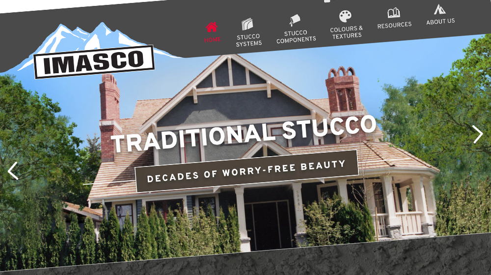 The company logo is prominent in the header of IMASCO’s new website. Stucco textures are used throughout the site along with the company colours: red, black and grey. Illustrations are used to help the user navigate the site. This website is primarily for the builders that need product information, product samples and distributor information.