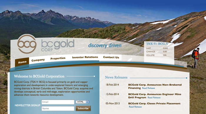 BCGold Corp. holds more than eight properties within British Columbia and the Yukon. In order to help BCGold easily publish company and property updates and news releases, Honeycomb Creative developed a website with an integrated back-end content management system. Visit our portfolio to view our work