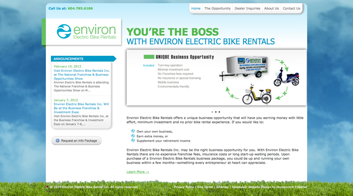 Environ Electric Bike Rentals Inc. promotes its unique and environmentally friendly business opportunity online with its new website developed by Honeycomb Creative. Visit our portfolio to view our work and a link to the their site where you can learn how Environ Electric Bike Rentals can help you own and operate your own business.