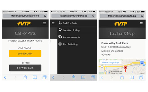Fraser Valley Truck Parts wanted to make it easier for clients to contact them from their cell phones, so we created a ‘mobile essentials’ website that looks similar to an ‘app’.