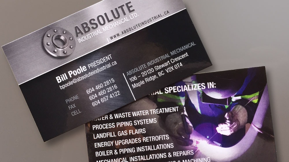 The printed business cards for Absolute Industrial Mechanical Ltd. of Maple Ridge, BC. arrived last week. The brushed steel background texture focuses on Absolute’s stainless steel welding expertise. We refreshed their logo with a cleaner font and separated the flange image from the type to make it more readable.