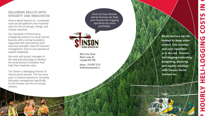 We created new direct mail pieces for Stinson Aerial Services. The new brochures promote Stinson Aerial’s heli-logging estimating, budgeting and planning services for the oil and gas, energy, and forestry industries. Visit www.stinsonaerial.ca to learn more about its heli-logging services.