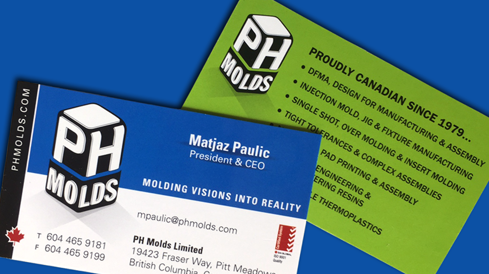 Honeycomb Creative has designed business cards and a new logo for PH Molds Ltd., a manufacturer of plastic molds and parts based in Pitt Meadows, BC.