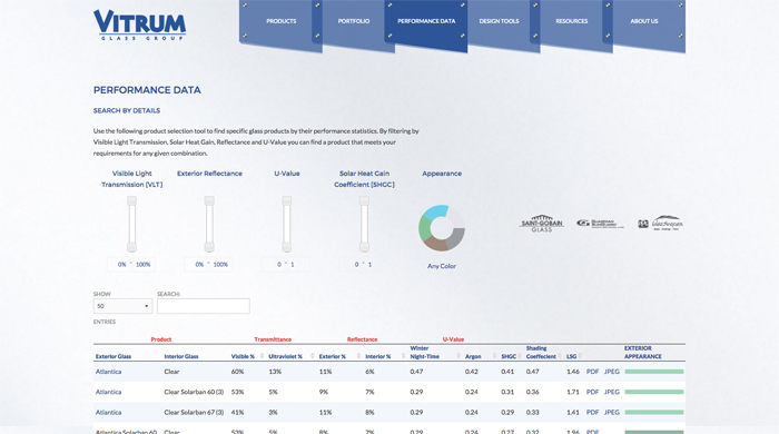 The new Performance Data application lets users find Vitrum’s glass products via a custom search that’s very user-friendly. Users can simply adjust sliders to set the search parameters for each category, like visible light transmission values. The search results quickly load in a table format below the sliders, showing product specs for easy comparison. This custom website function is both powerful and easy-to-use.