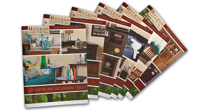 Six new colour catalogues are ready for local furniture manufacturer Hotzon Furniture Inc. Over 200 photos were retouched during production to create the six catalogues, each featuring one of its sustainable solid wood furniture product lines.