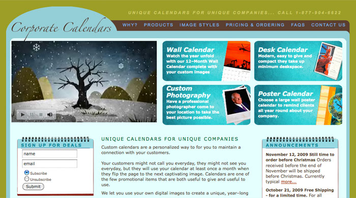 In advance of the holiday gift-giving season, Honeycomb Creative developed www.corporatecalendars.ca, a website that allows companies to supply their own digital photography for placement in desktop, wall or poster calendars. Corporatecalendars.ca encourages companies to choose images that will build strong connections between their offerings and their clients. Visit our portfolio to view our work